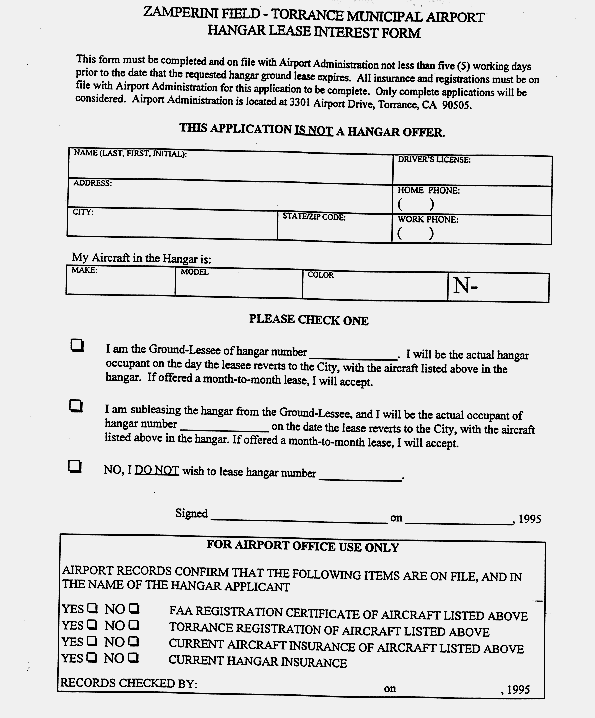Note: A copy of this Form will be mailed via Certified Mail to all persons on the Hangar Waiting List as of August 17, 1993. Persons on the existing Hangar Waiting List will be required to complete this Application Form, and return it with the $225 Deposit within seven ( calendar days of delivery of the Certified Mail. Failure to return the application, or to pay the deposit, will result in removal from the hangar waiting list.